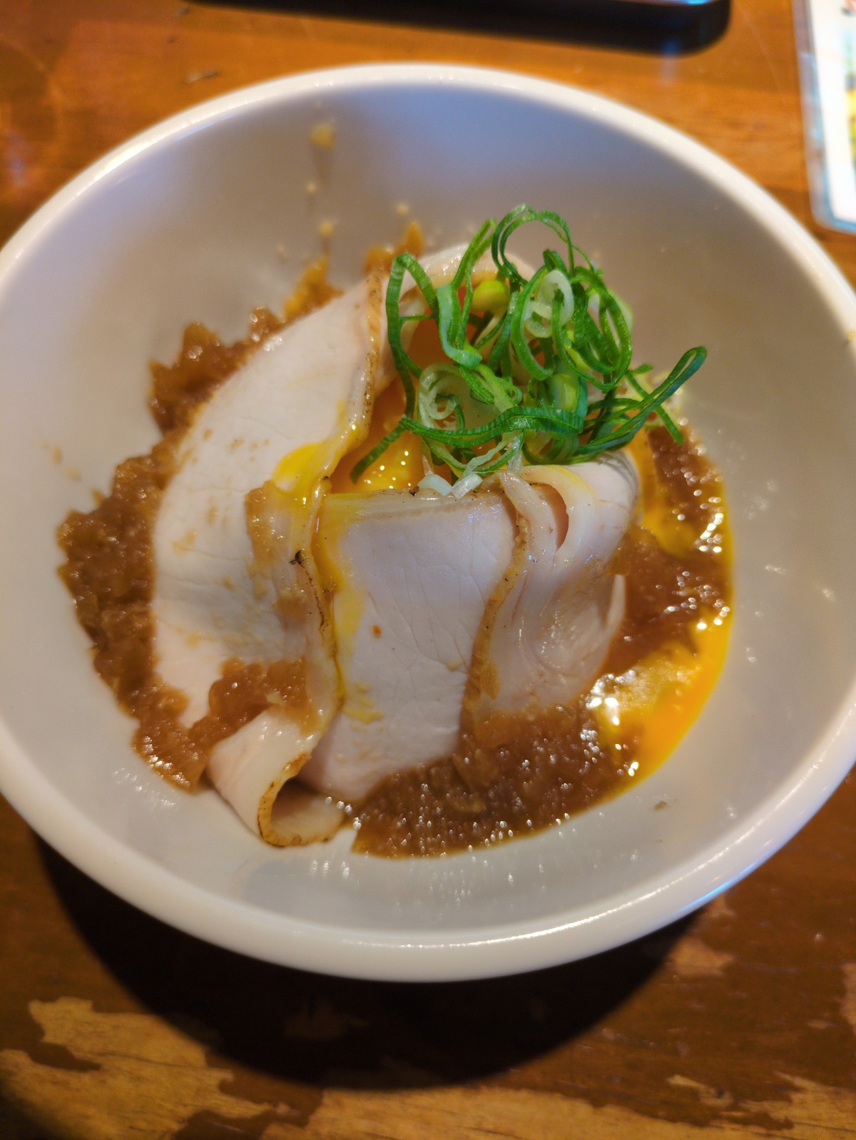鶏チャーシュー、低温調理の豚チャーシューはジューシーで旨い。