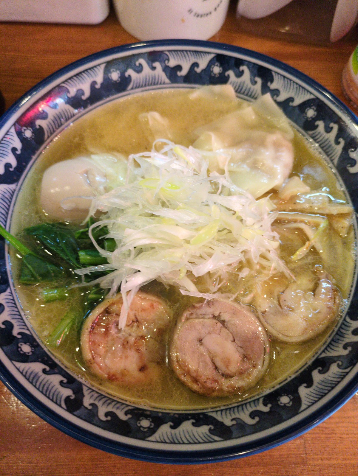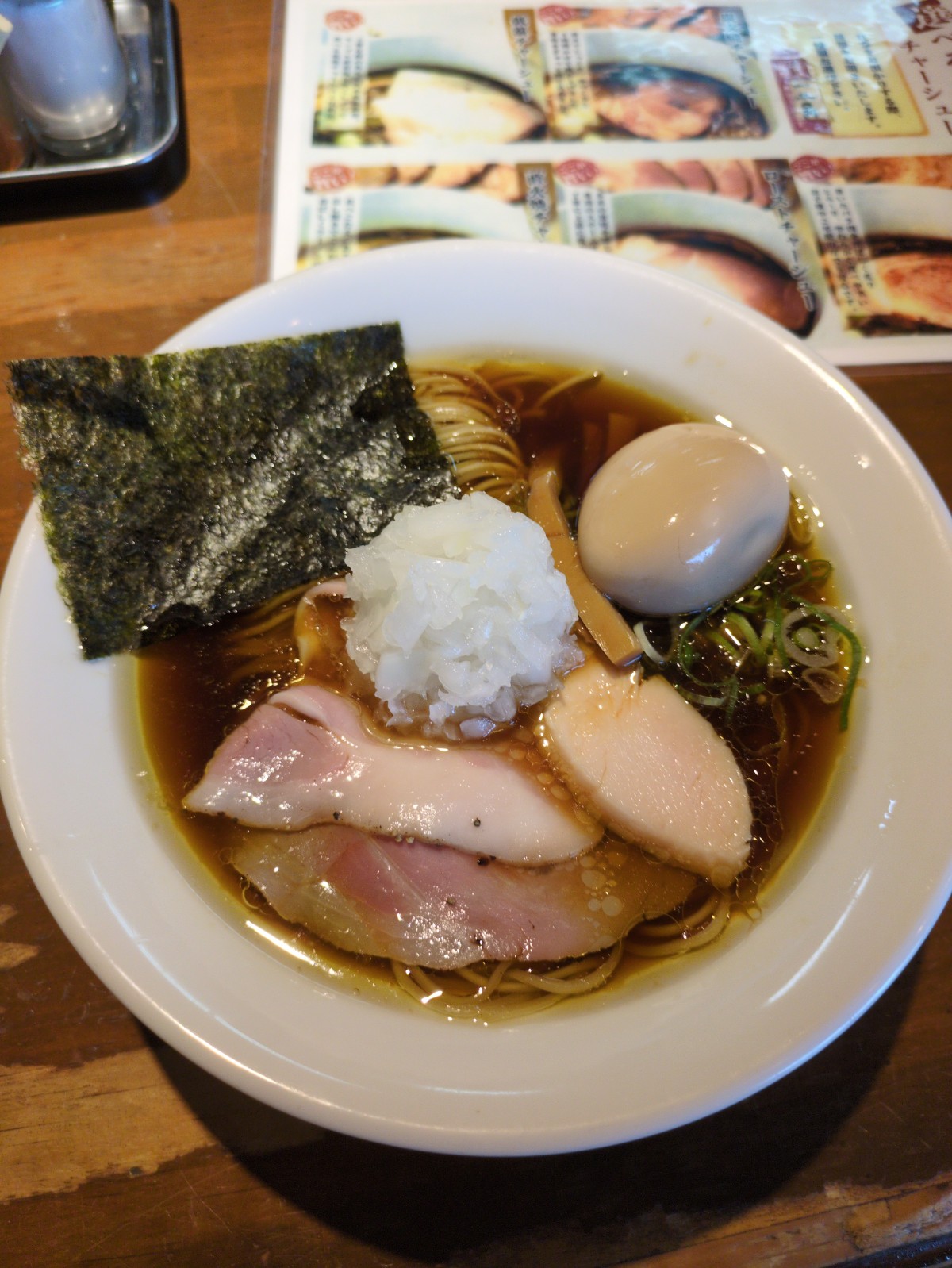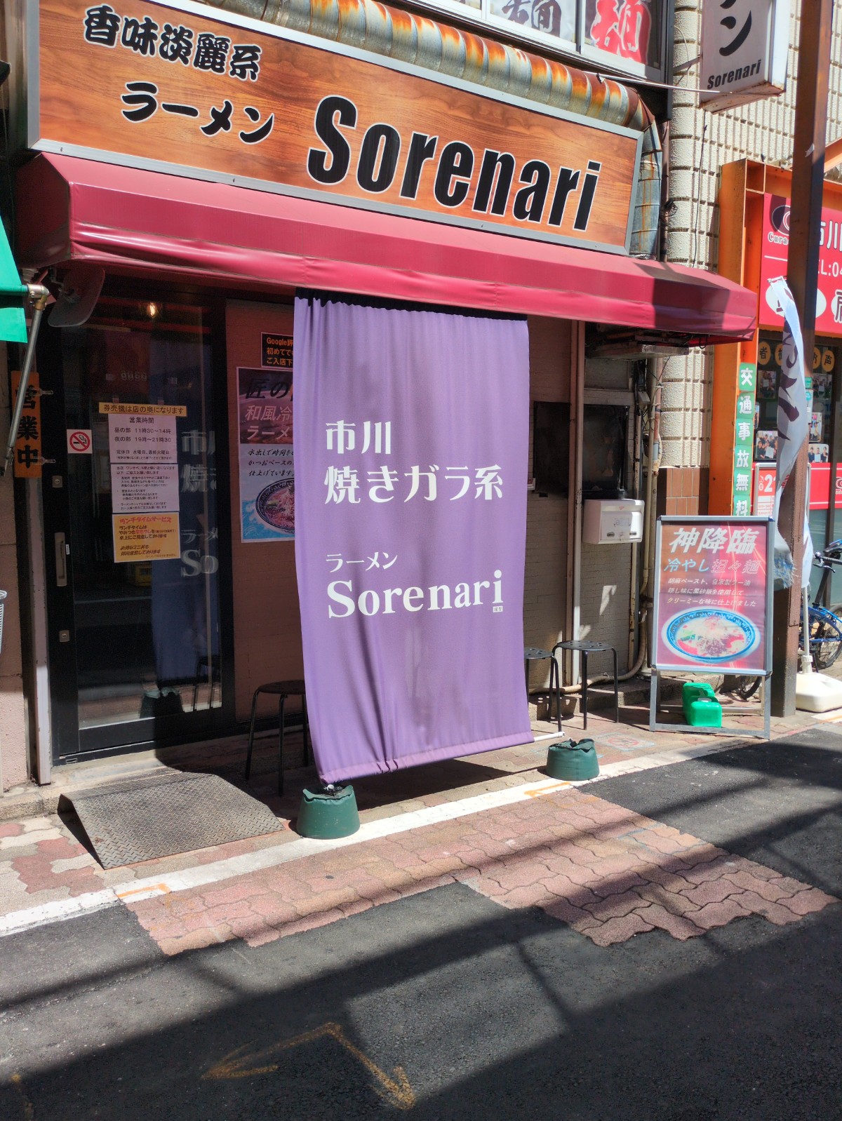 入口にある「市川焼きガラ系」の文字がどどんと目に入る「香味端麗系ラーメン Sorenari」へ。「鶏そば(塩)」に味玉とワンタンの追加トッピングで注文。