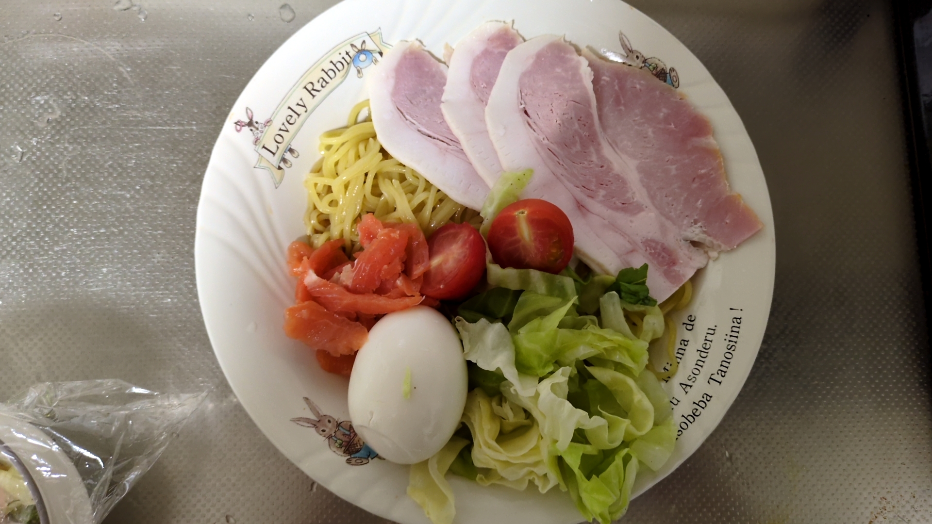 トッピングは、白出汁でゆでたキャベツ、ミニトマト、自家製味玉、スモークサーモン、ロースハムと贅沢に。