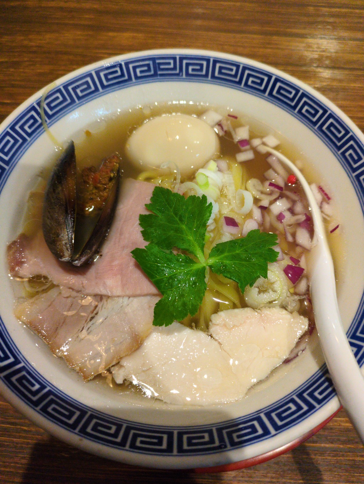 「熟玉貝だし塩そば」を注文。五分程度で着丼、美しいビジュアルとムール貝に目を奪われます。