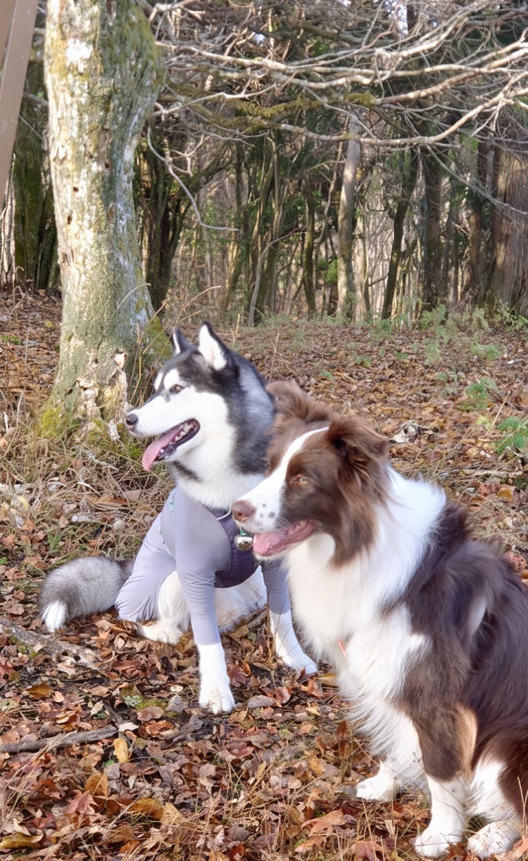 首に熊鈴をつけているので、ブルブルっとする度に鈴がジャラジャとなっていたのですね。とても賢こくて人懐っこい2頭でした。(ちょっとモフモフさせて頂きました)。