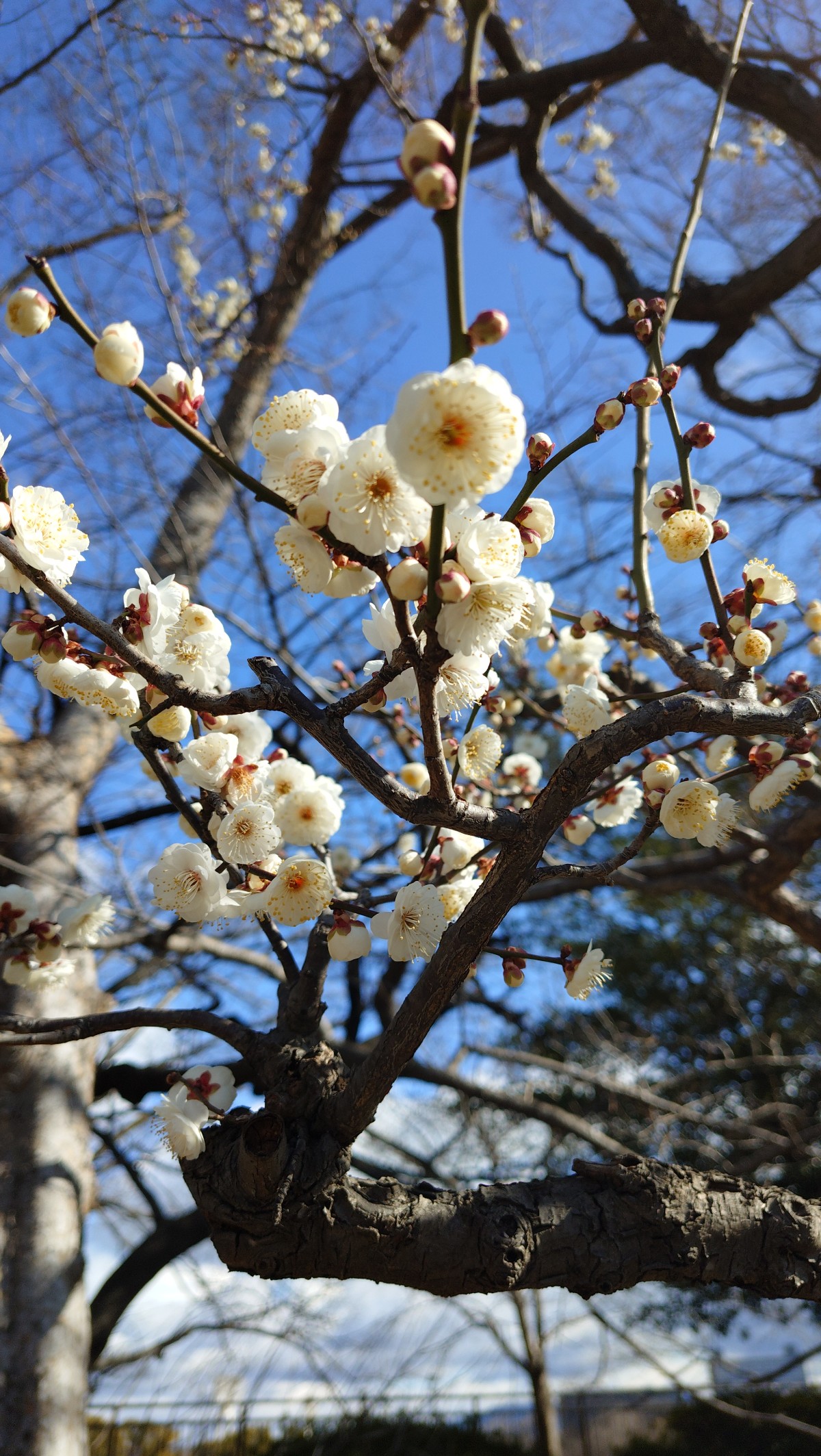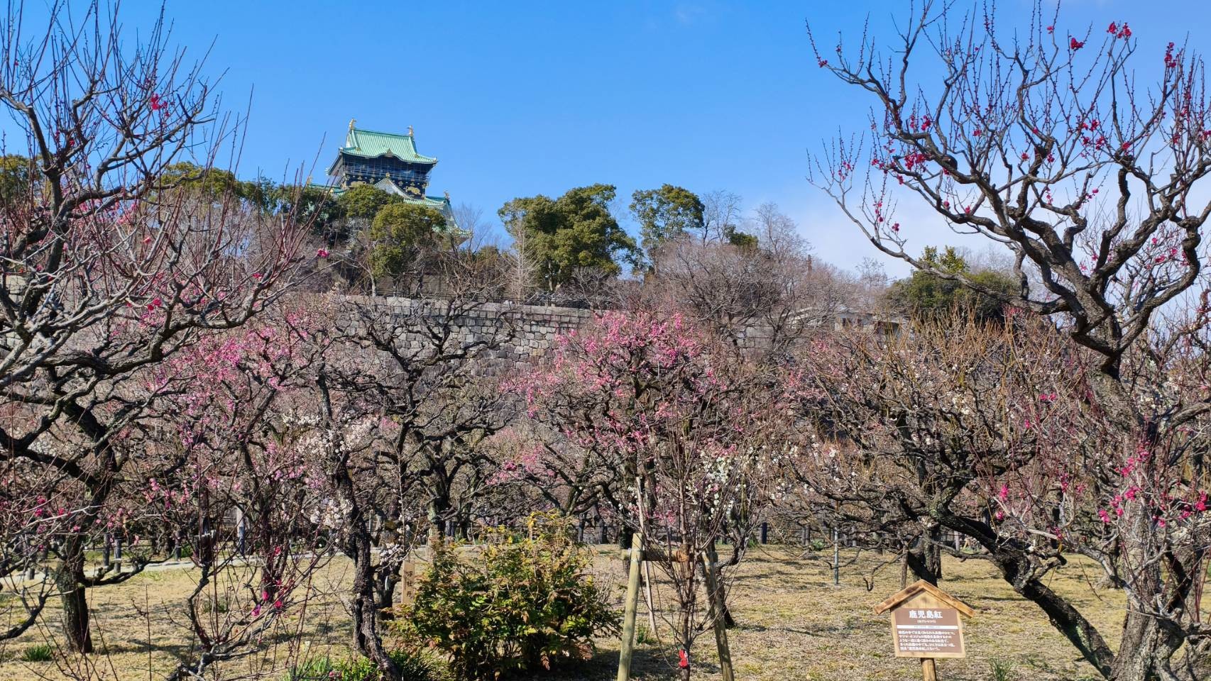 大阪城下には、梅林があるのですが、そろそろ見ごろのようです。内堀の東側、約1.7haの広さに約1,245本105品種の梅が植えられているそうですよ。